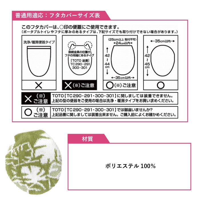 可愛い柄のトイレフタカバーです! ■特徴/仕様 普通(U型、O型)タイプのフタカバーとしてお使い頂けます。 洗浄暖房タイプにはお使いいただけません。 上手なお手入れ方法 ●お洗濯の際、ぬるま湯でなるべく中性洗剤を使用して下さい。 ●お洗濯の際、最初の2~3回はムダ毛が抜けたり 多少脱色することがありますので、他の洗濯物と別にお洗い下さい。 ●お洗濯の際、手洗いするか、 洗濯ネットをお使い下さい。 ●丸洗いしたあと脱水機にかけ、陰干しして下さい。 ●塩素系漂白剤は、ご使用しないで下さい。