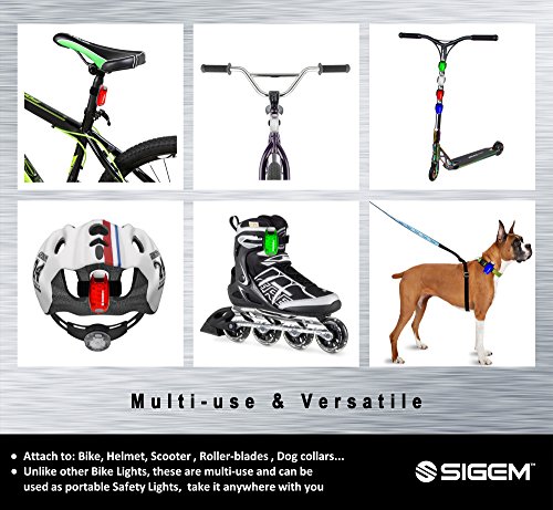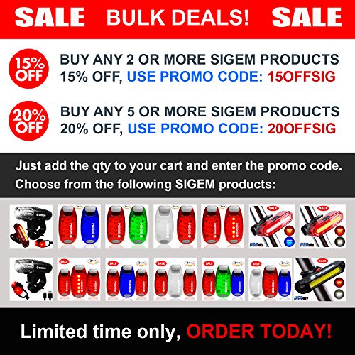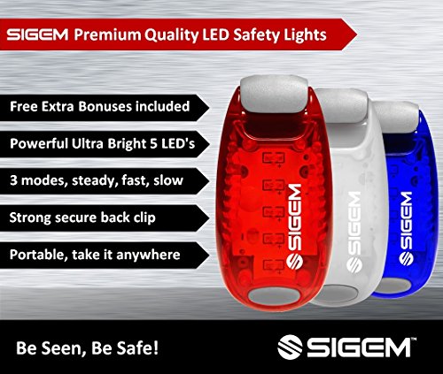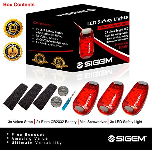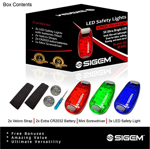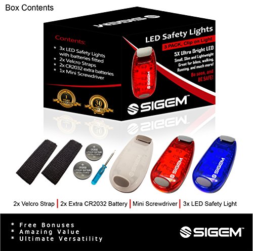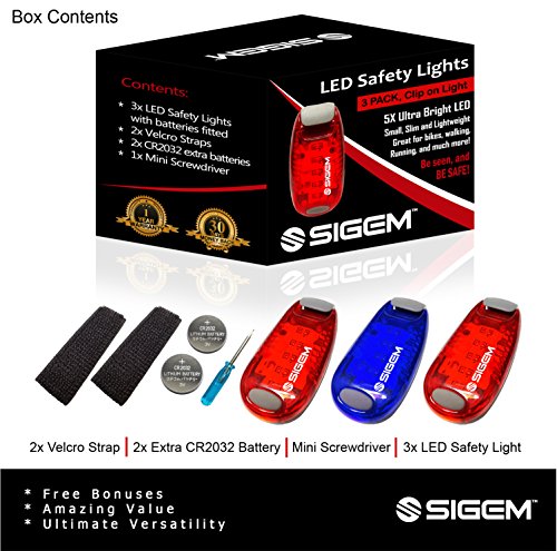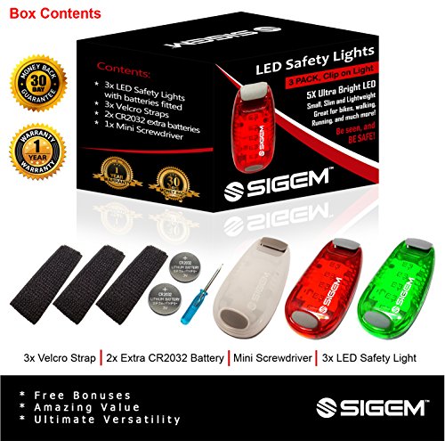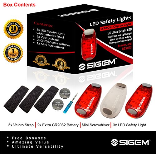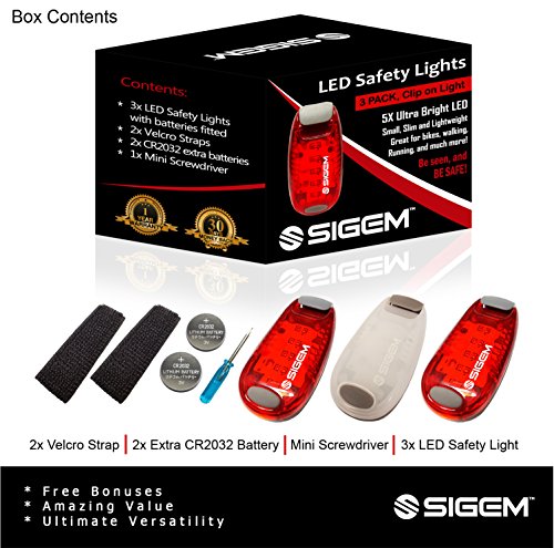 SIGEM - LED Safety Light (3 PACK) with free bonuses With thousands of US pedestrians and cyclists being killed in traffic accidents every year, safety is a top concern for everyone. You know what they say, better be safe than sorry. Well you can be SEEN and be SAFE with these 3X (family pack) LED Safety lights. This Essential device can help you enjoy a wide range of outdoor activities and be safe including: ?Running ?Jogging ?Walking ?Cycling ?Walking the dog ?Climbing KEY FEATURES BENEFITS ?Powerful Ultra Bright 5 LEDs, lights per device ?Strong secure clip, attaches to clothing or accessories ?3 modes, steady, fast strobe, slow flash, operated by pressing the button ?Up to 100 hours of illumination (dependent on usage) and with 2x extra spare batteries. ?Extremely versatile, has many uses and it is weather resistant ?Portable, take it anywhere with you. ?30 Money Back Guarantee, if you are not completely satisfied ?1 Year Warranty PACKAGE CONTENTS ?3x LED Safety Lights ?2x Extra Batteries ?2x Velcro Straps ?1x Mini Screwdriver HOW TO USE: There are 3 setting modes: Steady, Fast Strobe, Slow flash. Press the button to select the desired mode, press again to switch off. Conveniently simple to use. GUARANTEE: Have complete confidence and peace of mind, as your purchase is backed by a 30 Day 100% Money Back Guarantee. Either you love the product or if you're not completely satisfied, get a full refund. The Item must be returned within 30 Days from purchase in a good condition. Plus there is a one year manufacturer's warranty. This special offer price is available for a limited time only and so place your order today. 0 |