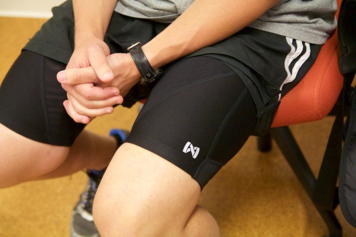 As the wearer's legs swing around the hip, different panels become stretched and counteract that motion, requiring the muscles to generate more power. Because the panels only resist against rotation of the limb around a joint, increasing torque, the muscles work harder without placing any additional strain on the joints.