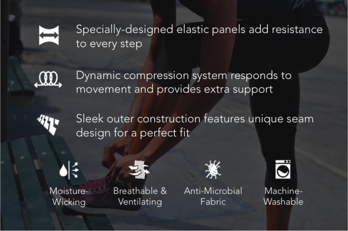 Our unique resistance technology features specially-positioned elastic bands and panels that counteract target muscle groups, increasing the amount of work you do with every step. The result is similar to strapping on a set of ankle weights while you run, except safer, way more comfortable, and without the bulk.