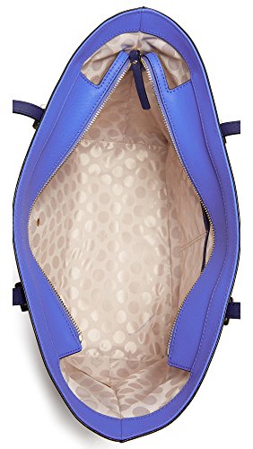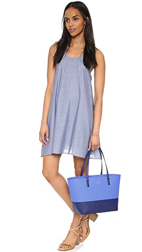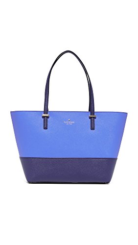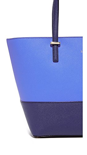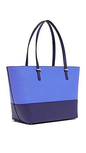 A structured Kate Spade New York handbag constructed from colorblocked saffiano leather. The top zip opens to a lined interior with 3 pockets. Pale, gold-tone hardware secures the slim straps, and petite feet protect the base. Dust bag included.Feature