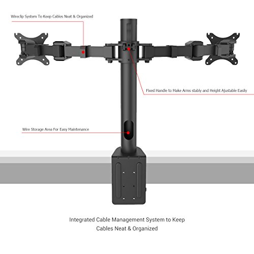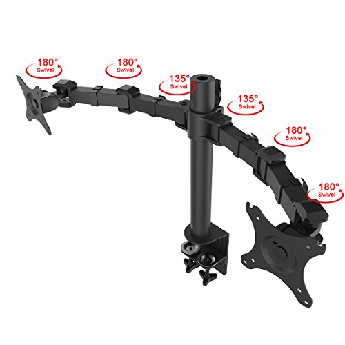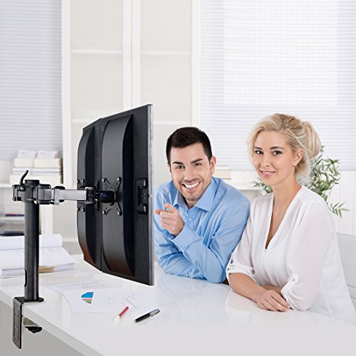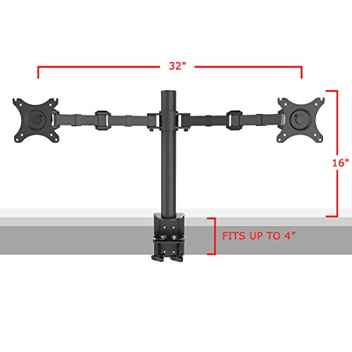 - Feature : Innovative desktop PC monitor desk riser that mounts Samsung, Acer, Viewsonic, LG, Dell, HP, Asus, AOC, eMachines flat panel LCD and LED displays from 10" to 27" . Compatible with VESA 75 (75 x75 mm) and VESA 100 (100 x 100mm) . / Dual arms are height adjustable on the vertical pole. Each monitor can tilt up or down 15 degrees, swivel 360 degrees and rotate 360 degrees. Rotating the monitor holders allows landscape or portrait positioning. / Improve the ergonomics of your office workstation by raising to monitors to an ergonomic height on your desktop, depending on your sitting position. Avoid neck, shoulder and back pain by improving your posture.The pole measures 16 inches. / Heavy-duty design supports up to 22 lbs per monitor. C clamp base has integrated double lock that ensures stable mounting onto the desks. This multi-monitor stand can be mounted on tables up to 4 inches thick. Arms come with clips for cable management. / Mounting two monitors side by side, over the desk will improve your productivity by preventing the need to switch screens for different applications. Depending on the user and desk height, this mounting bracket can be used for standing desk applications.