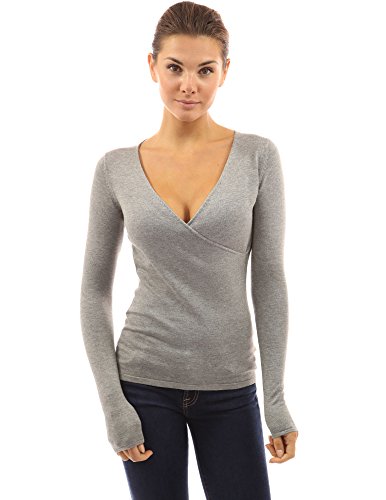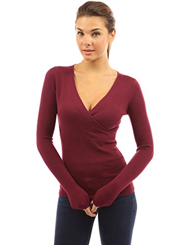 PattyBoutik V Neck Crossover Faux Wrap Long Sleeve Pullover Knit Top Sweater. Model in pictures is 5 feet 8 inches (173cm) tall wearing size S.