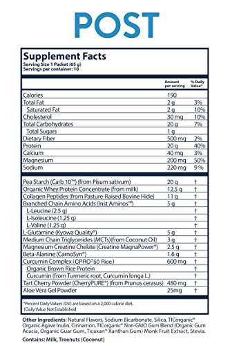 Post reduces muscle fatigue and next day soreness by supplying your body with the proper macro and micro-nutrients