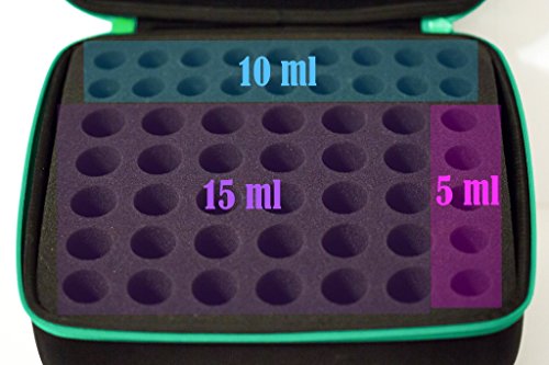 - LARGE CAPACITY secure storage for 53 BOTTLES:15ml bottles (30), 10 ml bottles (18), and 5ml bottles (5) (bottles in photos not included). Plenty of room for 10 ml bottles with roller ball tops. In spite of the high capacity, it's small on the outside.