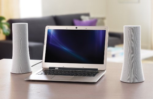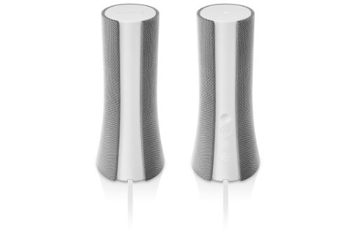 -. Feature : Beautiful speaker design: Gentle curves and a premium fabric finish add a graceful note to any space / Effortless Bluetooth wireless: Stream audio from your Mac or PC computer, tablet or smartphone and easily switch between devices / Clear, room-filling sound: 3 high-performance drivers per speaker deliver strong mids, highs and rich bass / Touch volume control: The entire top panel of the right speaker is a touch disc. Simply glide a finger to dial volume up or down / Works with almost any audio device: Connect wirelessly to non-Bluetooth computers and tablets using included USB Bluetooth transceiver. Or use the 3.5mm auxiliary input to plug in any device with audio output like TVs, iPods or game consoles