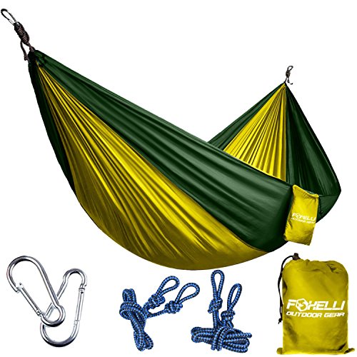 Foxelli #1 Camping Hammock – Ultralight Nylon Portable Parachute, Best for Light Backpacking Survival Beach Travel & Backyard Fun – Tree Ropes and Carabiners Included