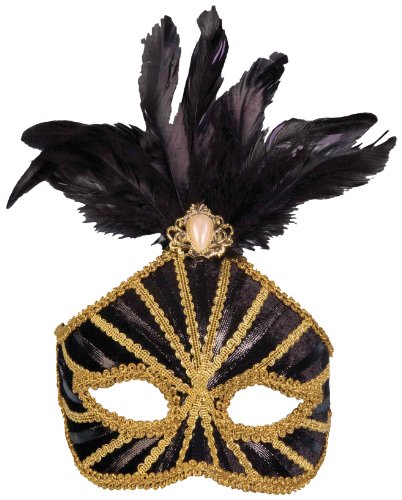 -. Feature : High half mask covers the eyes and forehead with rich fabric and gold trim / Midnight fabric and feathers, accented with a gem / Perfect for Mardi Gras or any other masquerade event; one size fits most adults and teens / Historically, masks allowed people of lower classes to mix undetected with aristocrats, men to dress as women, humans to look like animals, all of which would have been considered taboo outside the carnival atmosphere of a masquerade / You're sure to be pleased with the quality craftsmanship of Forum Novelties' Venetian style masks