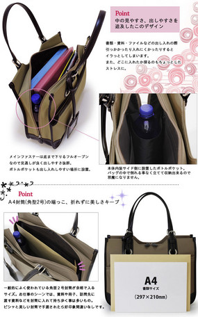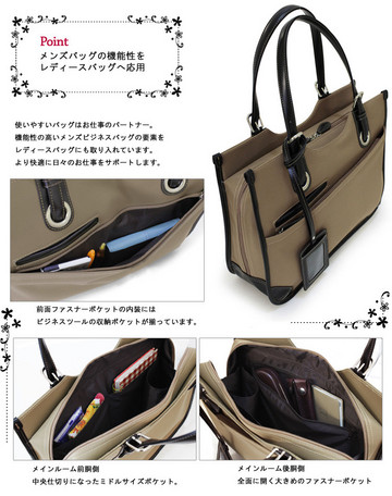メンズビジネスの機能性を女性目線の使いやすさに応用したお仕事用トートバッグ。