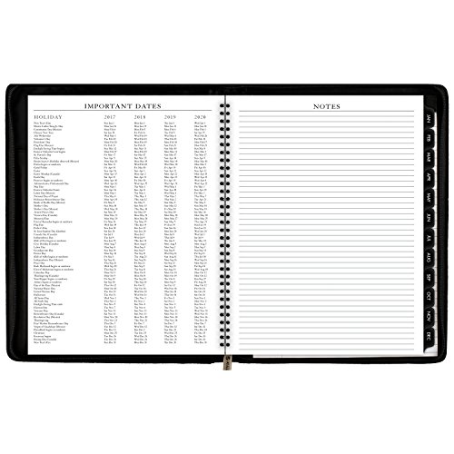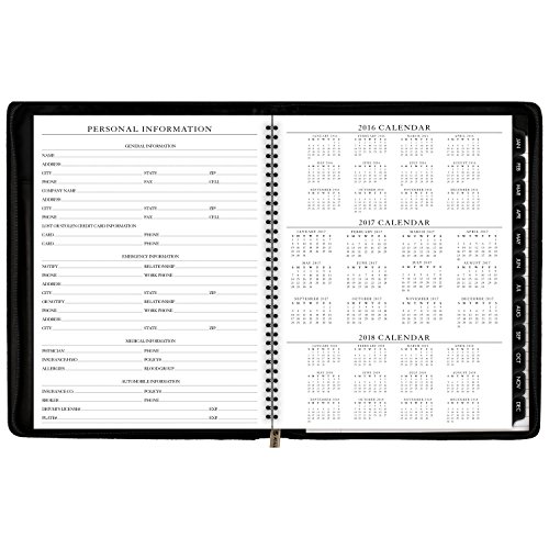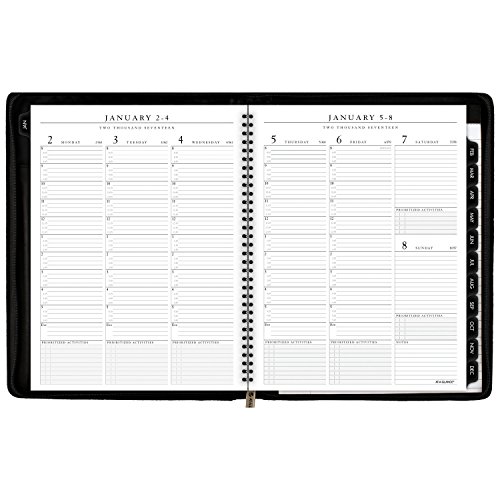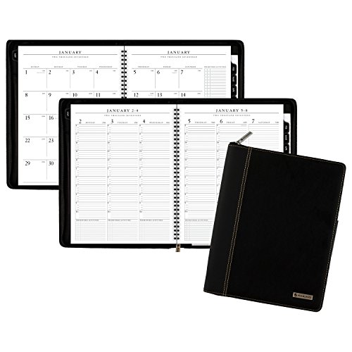 -. Feature : Stay organized from your home office with this Executive style planner. 12 month date range covers a full calendar year from Jan - Dec. Julian dates. One week per two page spread with hourly appointments for detailed planning Monday - Friday. / Appointment times are quarter-hourly from 8 a.m. - 5:45 p.m. to keep you on time for meetings. Mylar reinforced tabbed, monthly calendar pages included to view a whole month quickly. One month per two page spread with unruled daily blocks. / Note pad included provides extra writing space and a telephone / address section. Special info section also included to meet your organizational needs. Appointment book pages resist ink bleed and contain 30% post-consumer waste recycled material. / Deluxe, flexible black cover looks professional. The wire binding is concealed and the front interior includes storage pockets and business card holders. Zipper closure keeps everything secure. / Paper is high quality and resists ink bleed. 8.25 in. x 10.88 in. page size. Planner is refillable; refill pages sold separately.