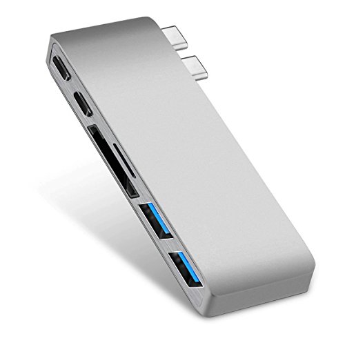 -. Feature : Suit for 13" and 15" 2016/2017 MacBook Pro with dual Type-C ports (Thunderbolt 3 port and USB-C port). / Pro Hub's Thunderbolt 3 - up to 5k or 2x4k @ 60Hz video, up to 50Gb/s data speed(MAX); 2 USB 3.0 ports - 5Gb/s data speed; USB-C port - up to 10Gb/s data speed; SD/Micro card reader - up to 104MB/s; Support strong power input, charging your laptop while connecting all supportable peripherals and transferring data & 1.5A output per usb port which can perfectly operating max 2TB external usb driver. / Compact and Stable Double Type-C Connection - the compact and easy-to-use design makes it simple to take the Type-C USB Hub with you anywhere you go; Designed with two type-c input ports to avoid losing connection to your MacBook Pro even by the slightest movement. / Plug and play - does not require any software, drivers, or complicated installation process.