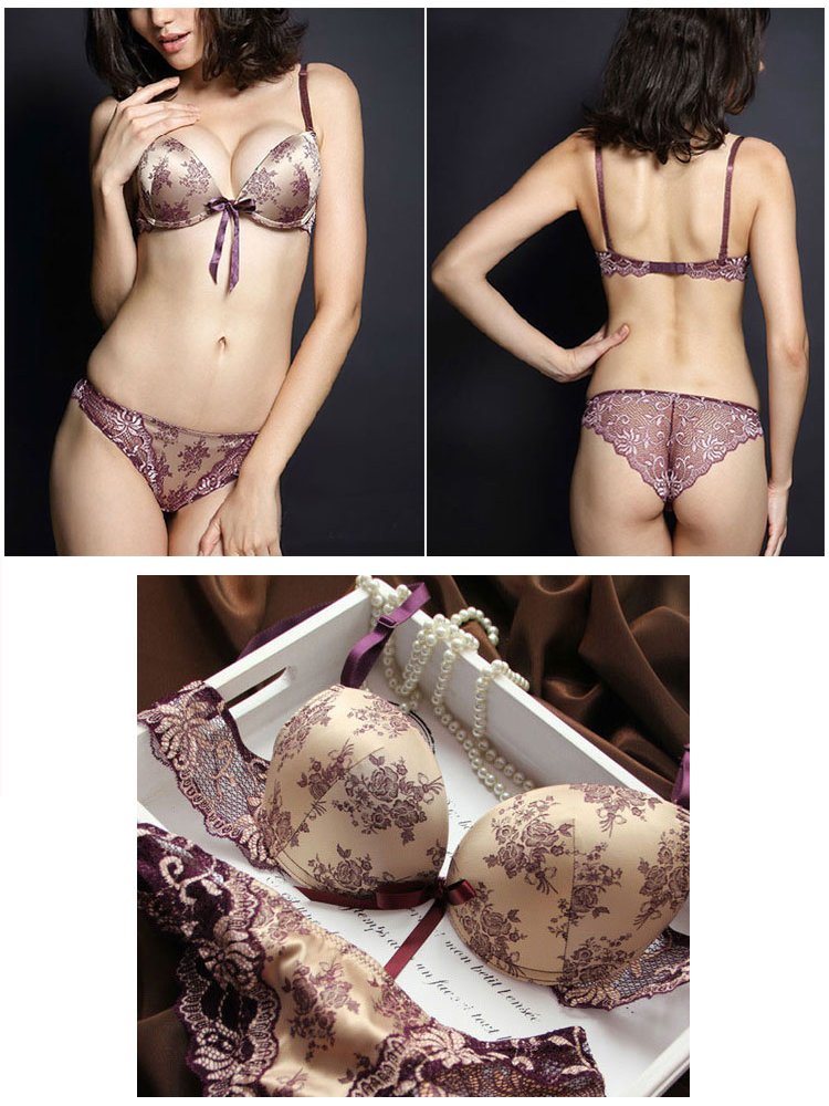 Underwear Flower Pattern Print Satin Lace Ribbon 3/4 Cups Upper and Lower Bra Panties