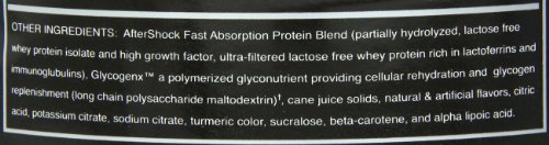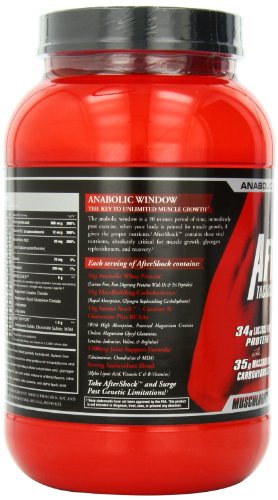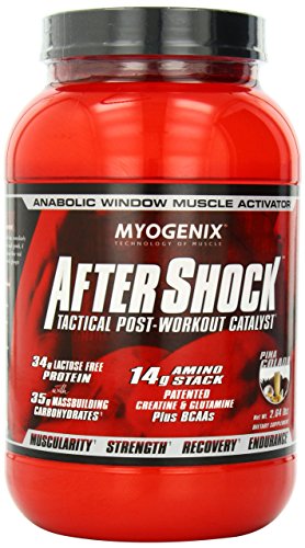 Studio : MYOGENIX Publisher : MYOGENIX Binding : Health and Beauty Product Description The Key to Unlimited Muscle GrowthThe window is a 30 minute period of time, immediately post exercise, when your body is primed for muscle growth, if given the proper nutrients. AfterShock contains these vital nutrients, absolutely critical for muscle growth, glycogen replenishment, and recovery. Each serving of AfterShock contains:34g Whey Protein (100% Lactose Free, Fast Digesting Proteins With Di Tri Peptides)30g Mass Building Carbohydrates (Rapid Absorption, Glycogen Replenishing Carbohydrates) 8g Amino Stack - Creatine Glutamine (High Absorption, Patented Magnesium Creatine Chelate And Magnesium Glycyl Glutamine)7.25g Branched Chain Amino Acids (Leucine, Isoleucine Valine)1500 mg Joint Repair Formula (Glucosamine, Chondroitin MSM)1500 mg Antioxidant Blend (Alpha Lipoic Acid, Vitamin C and B-Vitamins)Take AfterShock and Surge Past Genetic Limitations! 0