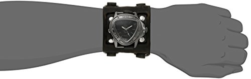 Rustic cuff watch featuring silver-tone triangular case with engraved bezel and dragon at center