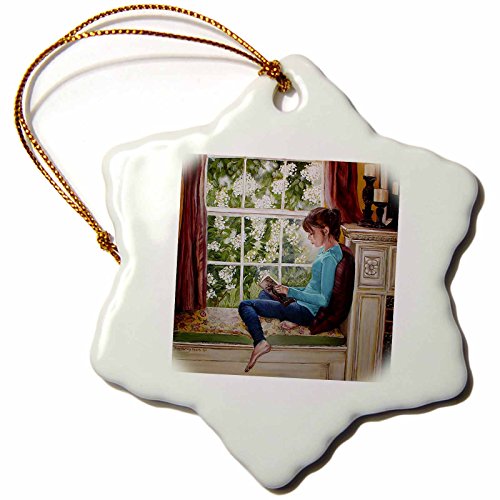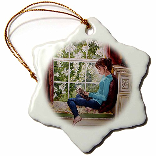 3dRose orn_44369_1 Girl Reading by Bright Window with Hydrangea Flowers Outside Snowflake Decorative Hanging Ornament, Porcelain, 3-Inch