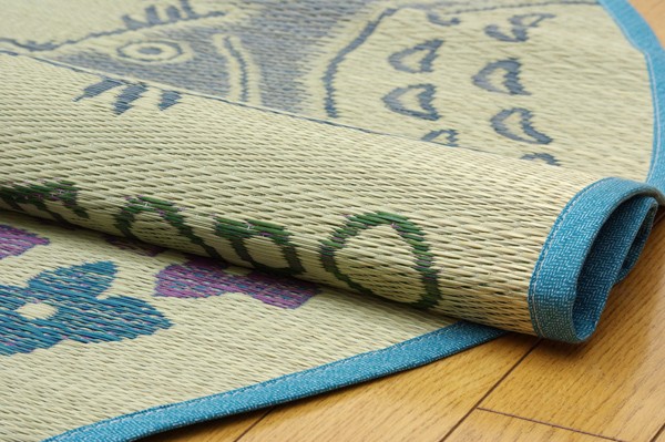 大人気。『となりのトトロ』のい草ラグです。コンパクトに収納できます。国産(九州産)い草を使用しています。一本一本が太く、表皮が厚く、繊維がキメ細かいので弾力性があり、耐久性に優れています。い草には空気の自然浄化作用、湿度の調節作用などがあります。また汚れにくく、使用するうちに黄金色に変化し味が出ます。い草に青森ヒバ加工を施しています。(抗菌、防臭効果)