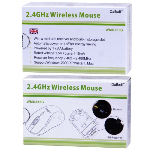 -. Binding : Electronics -. Brand : Daffodil -. Feature : Nano Receiver - Small enough to be left pled in during transport / 2.4GHz Radio Frequency Connection - Reliable operation from up to 10m / 2000dpi Optical Sensor - Works on any non transparent surface / Adjustable DPI - On the go adjustment of cursor sensitivity for precise control / Ergonomic 3 Button Design - Comfortable use for right and left handed operators -. Label : Daffodil -. Manufacturer : Daffodil -. PackageQuantity : 1 -. Platform : Mac OS X / Windows XP / Windows 7 / Windows Vista / Windows -. ProductGroup : CE -. ProductTypeName : CONSUMER_ELECTRONICS -. Publisher : Daffodil -. Studio : Daffodil -. Title : Daffodil WMS335 Wireless Optical Mouse 2.4GHz - Cordless 3 Button PC Mouse with Scrollwheel and Adjustable Sensitivity (MAX DPI: 2000) - For Laptop / Netbook / Desktop Computers - Supported by: Microsoft Windows (7 / XP / Vista) and Apple MAC (OS X +) - Battery Powered (1xAA Inc.)