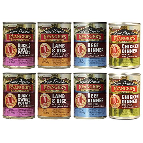 This Evanger's dog food variety pack will surely satisfy even the most finicky eater! All recipes are grain free, gluten free, and naturally made with premium-quality ingredients. Complete and balanced meals that meets the nutritional levels established by the AAFCO dog food nutrient profiles for all life stages. Variety pack includes 4 flavors: Chicken, Beef, Duck & Sweet Potato, and Lamb & Rice. 2 of each flavor, 12.8 oz. each, 8 cans total. Made in the USA.Feature
