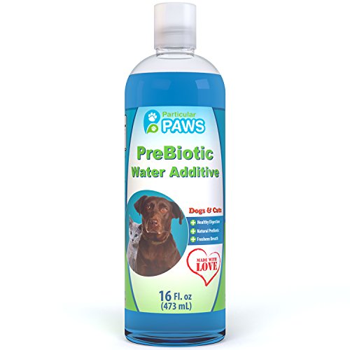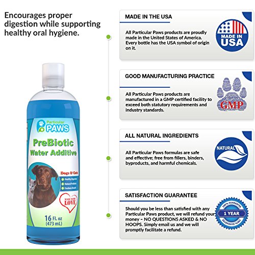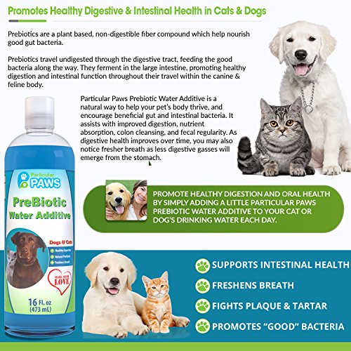 -. Feature : NOURISHES GOOD BACTERIA: A pre-biotic is a form of dietary fiber made from plants and vegetables. This is different from a pro-biotic, which is a dairy-derived product. Pro-biotics add good bacteria to your pet's system while pre-biotic nourishes the development of good bacteria within your pet's system. So even if you already give your pet a pro-biotic, a pre-biotic can have additional health benefits. / EASY TO USE: Pre-biotics are NOT affected by temperature or time, so storage is simple and easy. You simply add a few capfuls to your pet's water bowl whenever you fill it. The specific amount depends on your pet's weight, about one capful for every 20 pounds. The formula is virtually color-less and odor-free. / PROMOTES GOOD INTESTINAL HEALTH: Contains Aloe Vera, which can help reduce GI track inflammation while also working to rid the pet's system of toxins. Also contains Bromelin, a pineapple-derived extract which aids in the breakdown of many difficult to digest proteins. Good intestinal health also contributes to fresher breath and helps reduce tartar. / HELPS WITH JOINT PAIN: The pre-biotic also contains Papain, a collection of enzymes found in papayas. This can help protect against bone degeneration, joint pain and other symp often associated with arthritis. Suitable for pets of any age (although, as with any type of supplement, be sure and check with your vet beforehand). / SATISFACTION GUARANTEED: At Particular Paws, we stand behind our products 100%. If you're not completely satisfied, we'll refund your entire purchase P.R.Ice. All our products are made in GMP compliant facilities located within the United States.