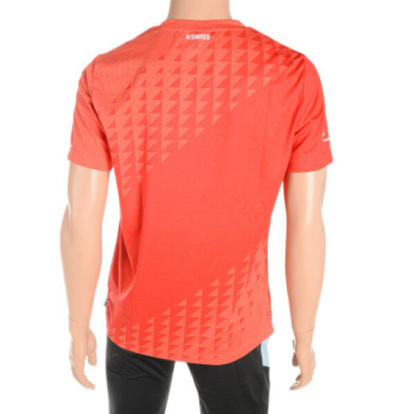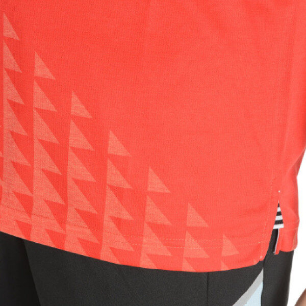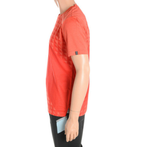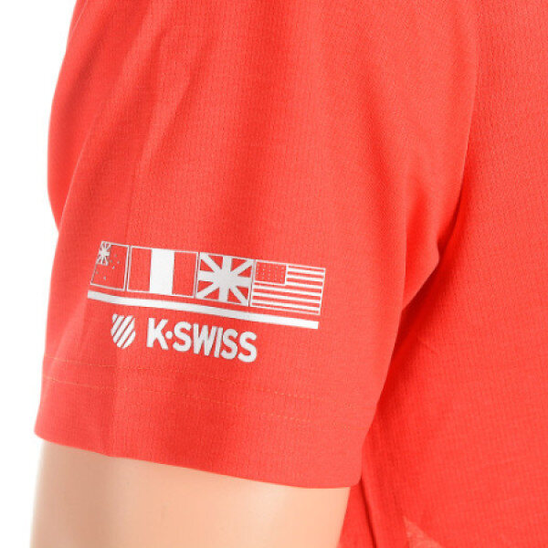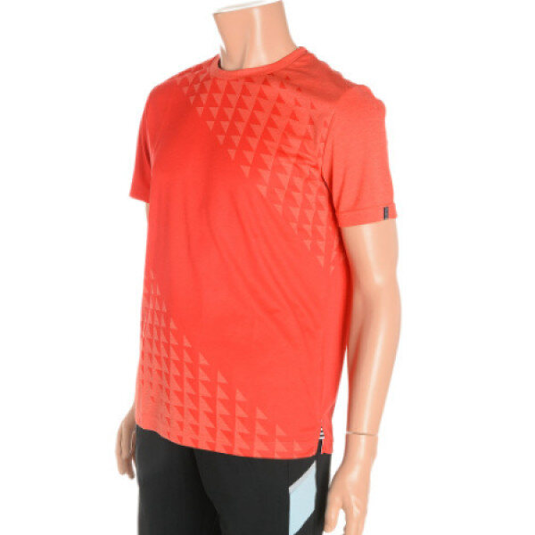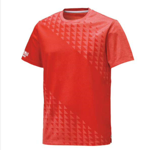 흡습속건이 우수한 멜란지 SINGLE POLY100%소재를 사용한 라운드 티셔츠.몸판에 톤온톤 패턴이 있고 양쪽소매 밑단에 아트웍과 라벨이 포인트.