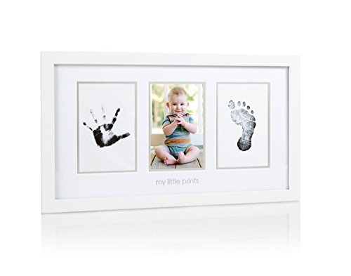 - PHOTO FRAME: This white hand-finished wooden frame holds one large 4” x 6” photo and features two 4” x 6” openings for baby’s hand and foot prints, which you can create with the included “Clean-Touch” The acid-free, beveled mat is stamped in silver with "My Little Prints.” This frame includes wall mounting hanger.