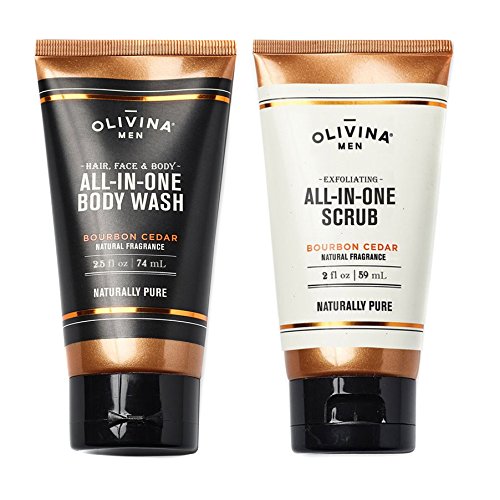 Two-pack that includes one Olivina Men All-in-One Body Wash and one Olivina Men All-in-One Scrub in "Bourbon Cedar" scent. These are the smaller size tubes of 2.5 fluid ounces each.