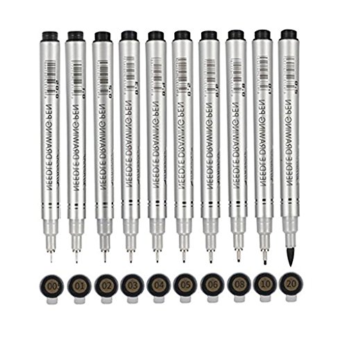 - Set of 10: Extra fine tip liner pens come with 10 different nibs size from hair-thin 0.05 mm, 0.1 mm, 0.2 mm, 0.3 mm to 0.4 mm, 0.5 mm, 0.6 mm, 0.8 mm, 1.0 mm and one brush pen (2.0 mm), meet all drawing requires.