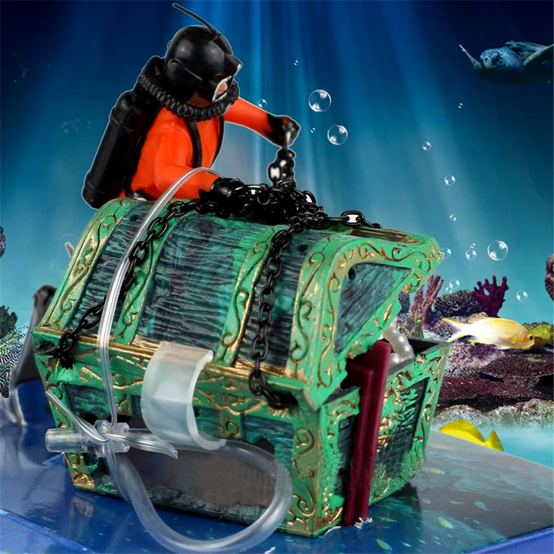 1. Chest sink to the bottom,divers from the "chains" attached to the chest suspended in water, along with oxygenation, divers in the water floating swing, like chest should strive to explore the way, is very nice and funny.