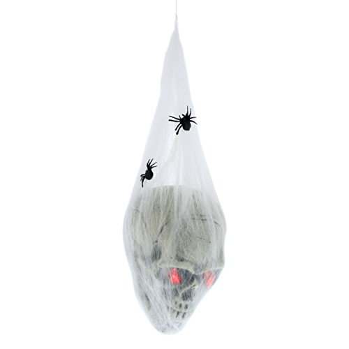 -. Feature : Realistic looking hanging life-sized plastic human skull that's been entombed in a spider web cocoon. This skull is not for the squeamish, as the web is also full of big creepy black crawling spiders. / The effect of this skulls spooky flashing evil red eyes just adds to the horror of this prop. / This frightening skull prop measures 10" long by 7" deep and 6" wide. It's a total 18" from the top of the web hanger to the bottom of the skull. / It's the perfect decoration for placement in a horrifying haunted house, graveyard or entryway! / It's a great finishing touch to any graveyard scene, as it adds a little more fright to the trick-or-treaters night!