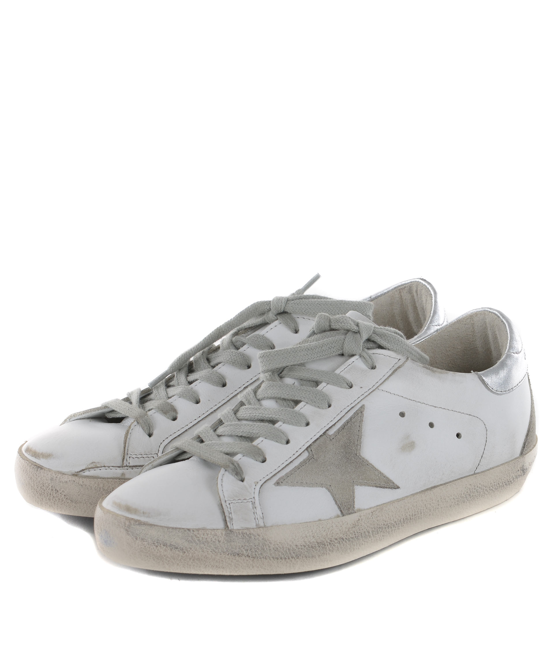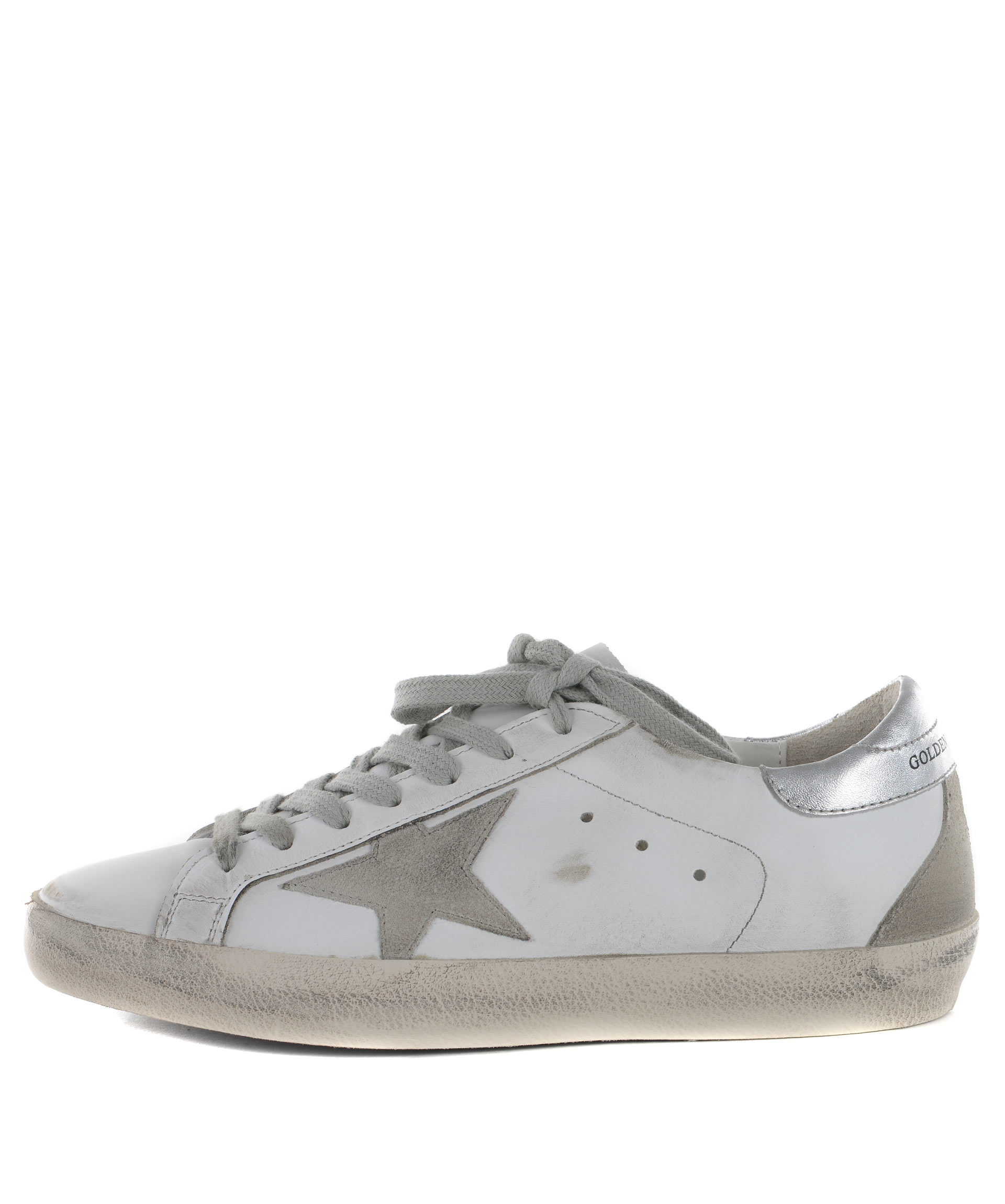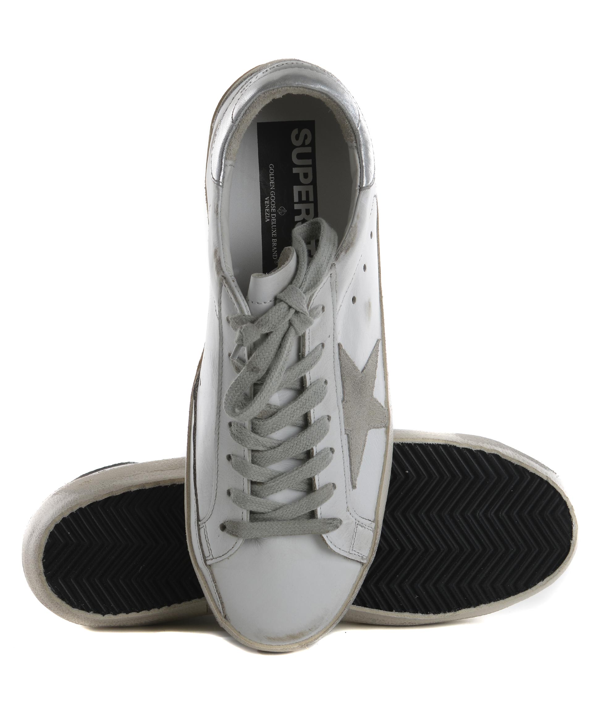 Superstar Sneakers from Golden Goose: White/Silver Superstar Sneakers with round toe, contrast heel counter, brand insole, lace-up front closure, star patch at side and flat rubber sole.