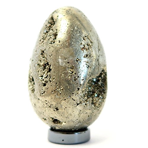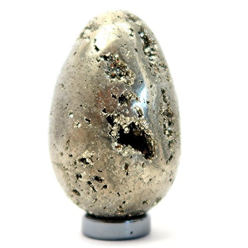 One-of-Kind: Natural Pyrite is polished into your new crystal healing egg. Pyrite is popularly known as Fools Gold for its golden metallic color. The weighty Iron Ore forms in brilliant clusters and perfect cube crystals. This Pyrite has been polished into an egg-shaped stone displaying glittering craters of crystal cubes. The unique Pyrite egg can be displayed on the included metallic black Hematine ring stand.