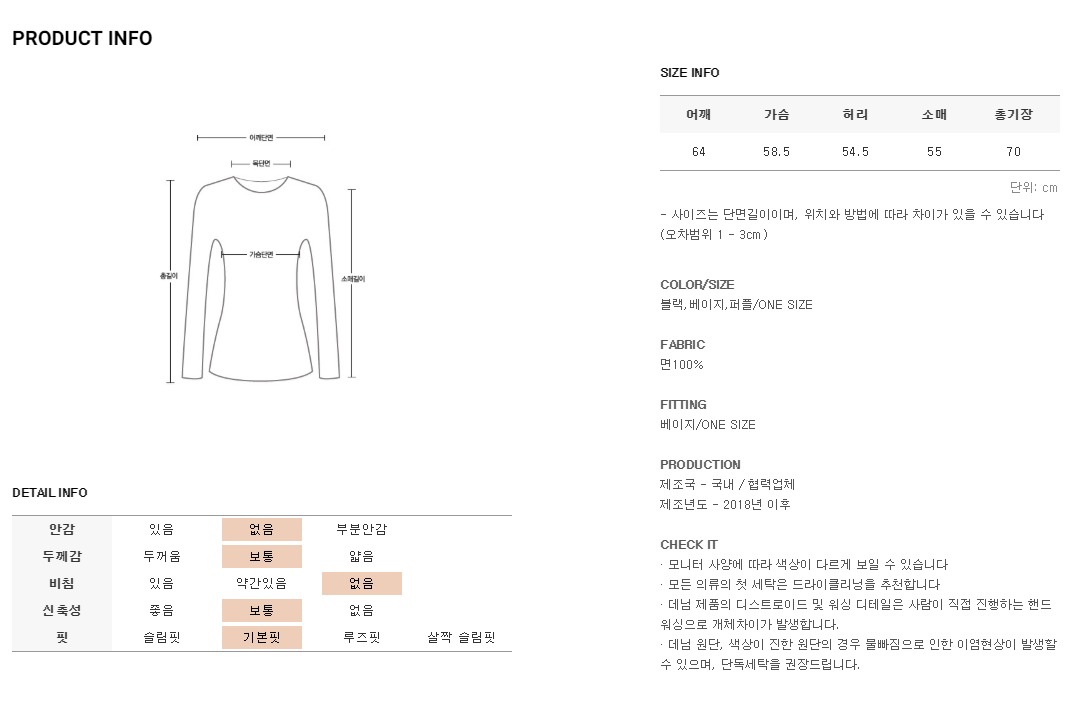 밑단과 소매, 넥라인에 시보리 처리로 늘어짐을 방지해주었어요