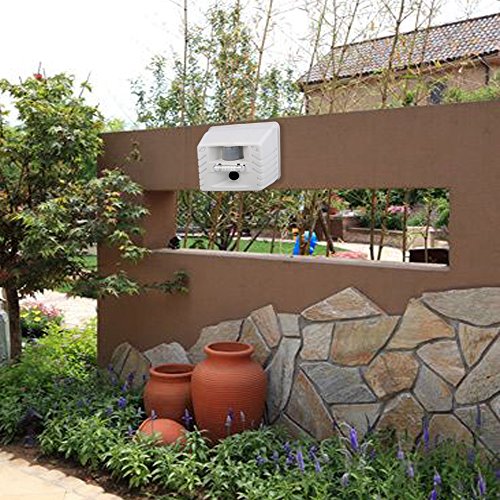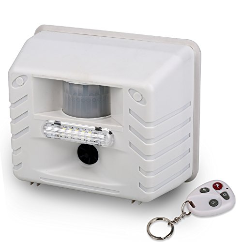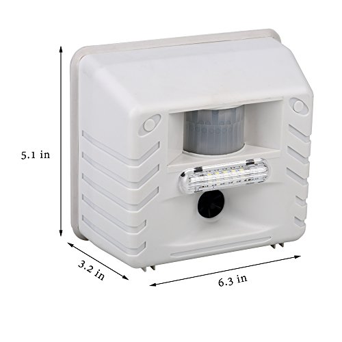 -. Feature : Chase destructive pests from your property, prevent damage and mess. Weatherproof, motion-activated. / Color: White, Weight: 950g Apx. Power: 110V 3.6Watt (Powered by A/C Source or 12V/24V D/C SLA Battery OR 4 AA Batteries) / Multifuctional: Infrared Motion Sensor + Ultrasonic Sweep + Strobe Light + Sonic Alarm + Remote control / Ultrasonic frequency: 15KHz-25KHz(adjustable for different animals). Effective range: 750m2. Output sound Pressure: 90db / Product size: 17 X 14 X 9cm, Package size: 25 X 19 X 10cm, comes with mounting holes and screws