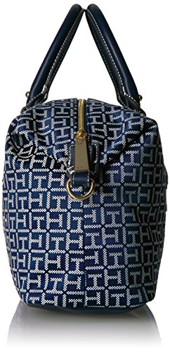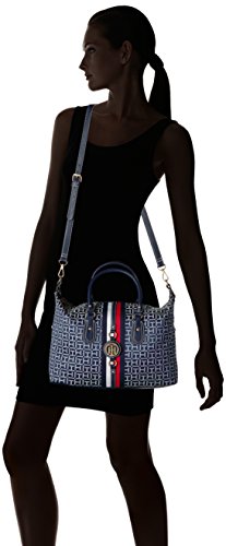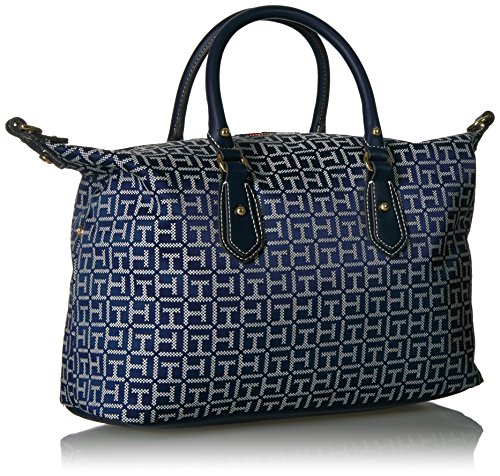 Top handle satchel handbags for women featuring the Tommy Hilfiger women signature flag stripe and gold TH hardware. Double top handles and removable convertible strap with gold hardware details. Flat bottom, top zip closure. Lined nylon interior with wall zip pocket and slip pocket. This Tommy Hilfiger bag is a versatile essential, perfect for your next work bag. Our timeless Tommy Hilfiger handbag is a stylish addition to your collection of top handle handbags. 13-3/4" length; 8-1/2" height; 5-1/2" width; 3-3/4 23-1/2" drop.Feature