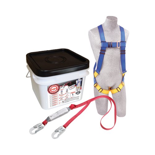 -. Feature : Full body harness and shock absorbing lanyard in handy container / Lightweight 5 point adjustment full body harness / Shock absorber limits arresting forces to 900-Pound / Snap hooks are ANSI Z359.1 compliant hooks. 3,600-Pound strength gates / Meets or exceeds all applicable OSHA and ANSI standards