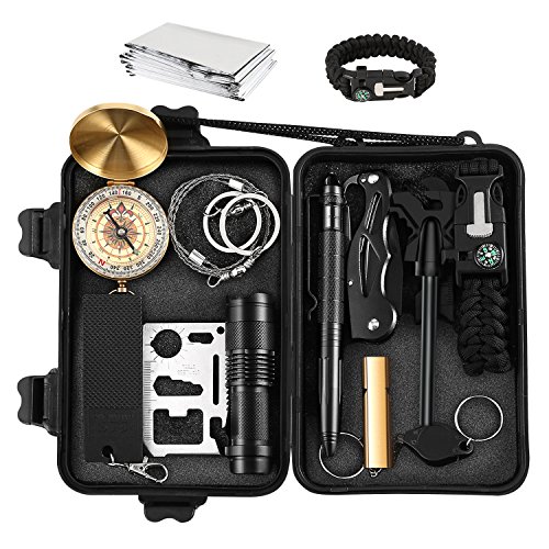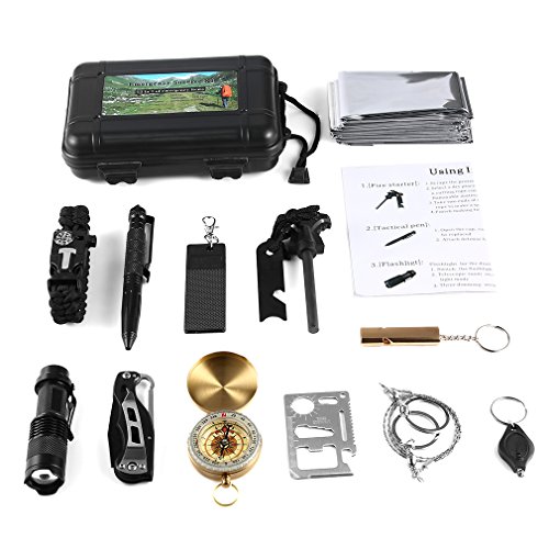 - Multi-purpose updated tactics kit 13 in 1 multi professional emergency survival kits,Containing: flint stone, scraper, flashlight, swiss card, mini light,wire saw,bracelet, compass, whistle, tungsten steel pen, emergency blanket and black box.
