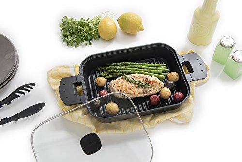Steam + grill steams and grills simultaneously by adding water to the ridge surrounding the grill resulting in delicious, juicy food