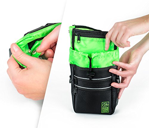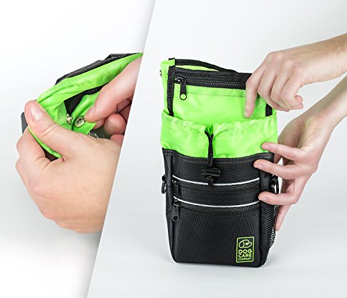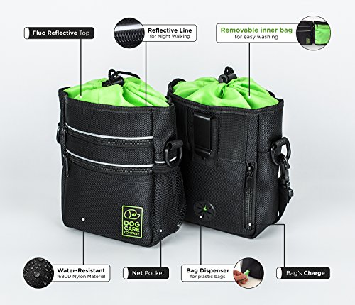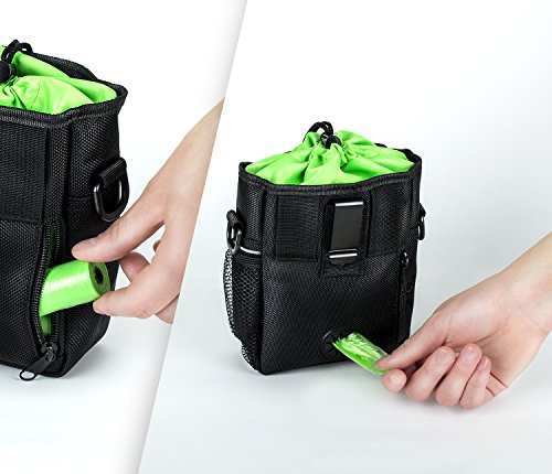 FEATURES: -the 3 reflective strips on your treat pouch allows you to have a safetly night time walk ; - built in doggie bag dispenser with a dog poo bag roll included; - durable drawstrings wich securely holds your rapid rewards ; - multifunctional D-rings ; - hands free and easy to carry with 2 straps included and one waist clip ; - easly clousure for quick treat access