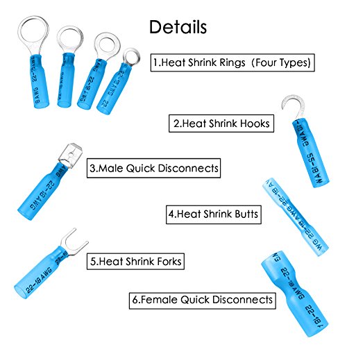 Studio : Shenzhen ZOTO Technology Co.,Ltd Publisher : Shenzhen ZOTO Technology Co.,Ltd Binding : Electronics Product Description b>SPECIFICATIONS: --Shrinkage ratio 3:1 --Dual-walled design tubing: polyolefin tubing on the outside and hot melt adhesive inside --Wire gauge imprint on connectors --Extensive selection: 9 connector types (forks, rings, hooks, quick disconnects, butt connectors) in 3 sizes (red, blue, yellow) --Start shrink temperature: 80℃ --Full recovery temperature: 130℃ --Operating temperature: from -55℃ to 125℃