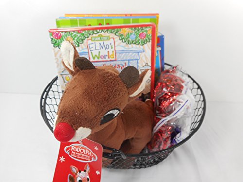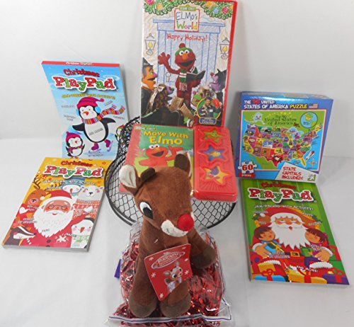 -. Title : Children's Toy Gift Basket -Small Stuffed Rudolph Doll, Puzzle of US, Elmo's World Happy Holidays DVD, Move with Elmo Press a Sound Book, 3 Christmas Play Pads, Wire Basket w/Decorative Shreds Bundle