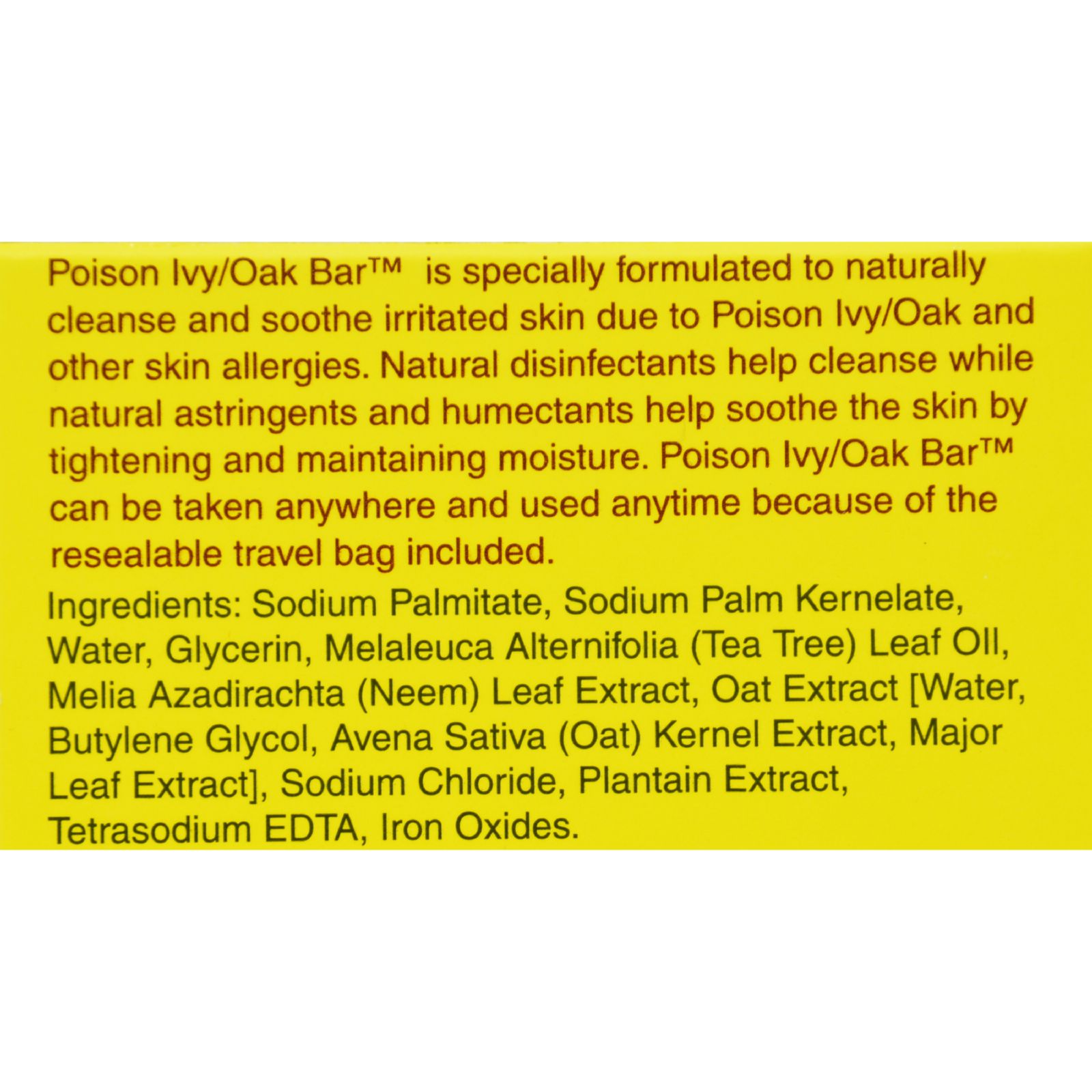 | All Terrain Poison Ivy Oak Bar Soap Description: All-Natural, Hard-Milled With Resealable Travel Bag Poison Ivy/Oak Bar is specially formulated to naturally cleanse and soothe irritated skin due to Poison Ivy/Oak and other skin allergies. Natural disinfectants help cleanse while natural astrigents and humectants help soothe the skin by tightening and maintaining moisture. Poison Ivy/Oak Bar can be taken anywhere and used anytime because of the resealable travel bag included. Disclaimer These statements have not been evaluated by the FDA. These products are not intended to diagnose, treat, cure, or prevent any disease. Ingredients : Sodium Palmate, Sodium Palm Kernelate, Water, Glycerin, Melaleuca Alternifolia (Tea Tree) Leaf Oil, Melia Azadirachta (Neem) Leaf Extract, Oat Extract (Water), Sodium Chloride, Plantain Extract, Iron Oxides and Tetrasodium EDTA. Size : 4 OZ Pack of : 1 Product Selling Unit : each |
