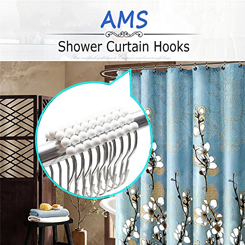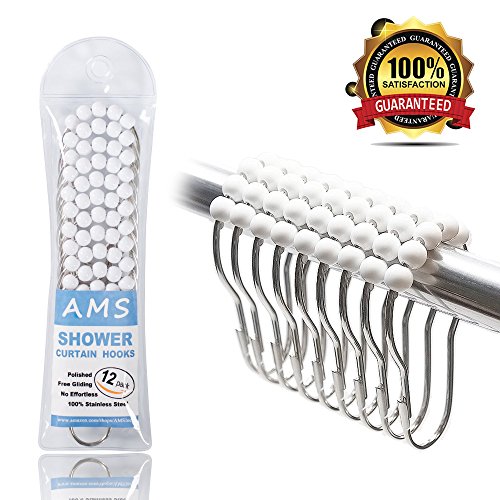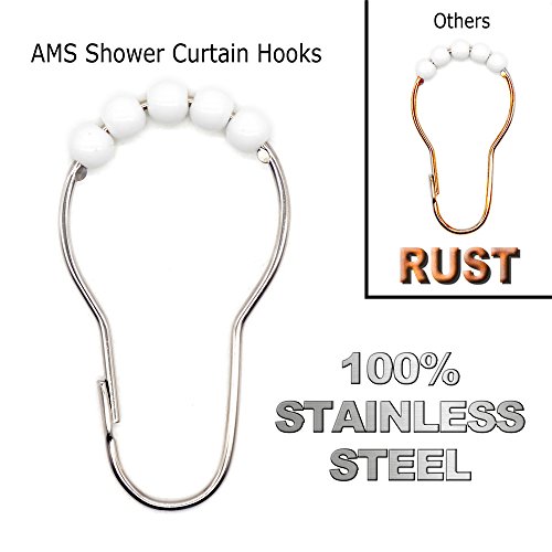 AMS Shower Curtain Hooks Rings - 100% Stainless Steel - Decorative with Polished Metal Frame,Set of 12 Rings (White)