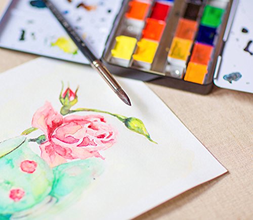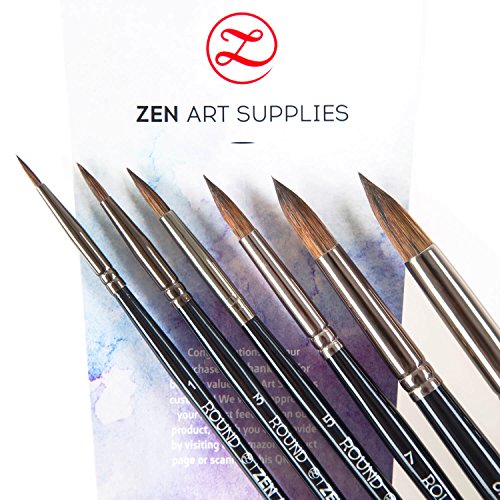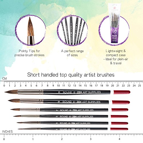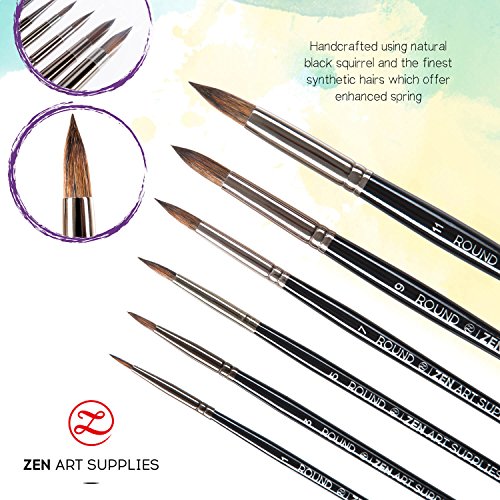 Professional Watercolor Brushes for Gouache, Watercolors, Fluid Acrylics and Inks - Round, Pointed, Long-Lasting Squirrel and Synthetic Blend, Short Handle, 6-pcs Set, Black Tulip Collection by ZenArt