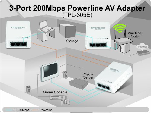 -. Binding : Personal Computers -. Brand : TRENDnet -. Color : White -. EAN : 0088020589613 -. Feature : Network computers, gaming consoles, and DVRs to the three Ethernet ports / 200 Mbps building-wide networking over an existing connected electrical system / Seamlessly stream videos, play games, and download files / Use one to transmit and up to 15* TPL-305Es to receive a networked signal. * Maximum of 16 adapters (nodes) recommended for streaming video across your network. / Advanced 128-bit AES encryption to ensure total network security / Windows-based Powerline configuration utility: compatible with Windows 7 (32/64-bit), Vista (32/64-bit), and XP (32/64-bit) operating systems / Network signal transmits up to 300 meters (984ft.) / Power Save mode reduces electrical consumption by 70% -. IsAutographed : 0 -. IsMemorabilia : 0 -. Label : TRENDnet -. Manufacturer : TRENDnet -. Model : TPL-305E -. MPN : TPL-305E -. NumberOfItems : 1 -. OperatingSystem : Windows 7 (32/64-bit), Vista (32/64-bit), XP(32/64-bit) -. PackageQuantity : 1 -. PartNumber : TPL-305E -. ProductGroup : CE -. ProductTypeName : NETWORKING_DEVICE -. Publisher : TRENDnet -. Size : AV200 -. SKU : 590489z -. Studio : TRENDnet -. Title : TRENDnet Powerline 200 AV Adapter with 3-Port Ethernet, TPL-305E -. UPC : 710931506235 -. Warranty : 3-year limited warranty