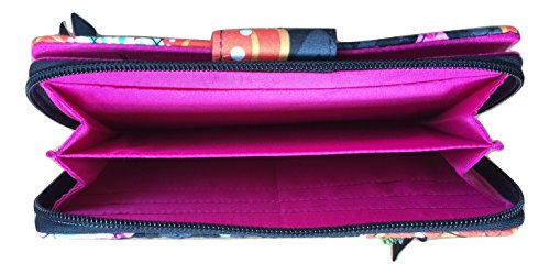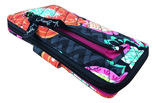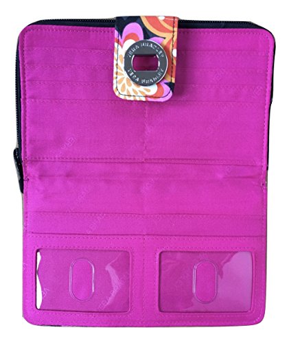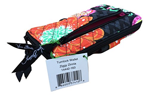 Vera Bradley's spacious Turnlock Wallet is made of soft quilted fabric on the outside with a coordinating solid custom print logo fabric on the interiors. There are two main compartments - a zip around portion features 6 card slots and two full length bill compartments. The tab and turn lock closure portion features another 6 card slots, 2 clear ID slots and a full length bill compartment. The back exterior features a zippered pocket. It measures approximately 7 3/4 inches (L) x 4 3/4 inches (H) x 1 inch (W). The location of pattern varies with each wallet. Spot clean with a damp cloth and mild soap. Patterns with solid color interiors are designed and manufactured for Vera Bradley Outlets.Feature