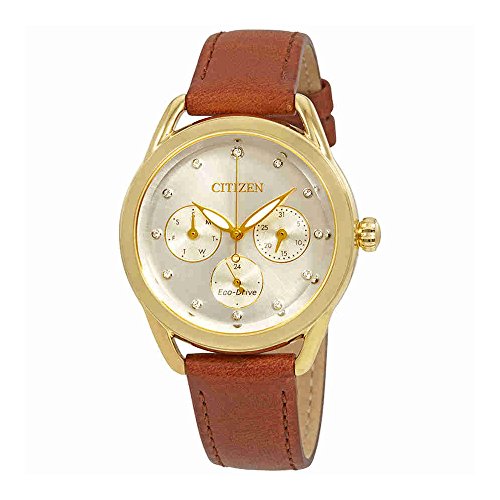 38mm gold-tone stainless steel case Mineral CrystalJapanese Quartz movement/ Eco-Drive, Never needs a battery, Charges in natural or artificial lightBright white dial with luminous gold-tone hands and Swarovski Crystal indicesDay/Date12/24 Hour Time3-Hand MovementSplash resistanceTawny brown leather strap with buckleCitizen Style#: FD2052-07A