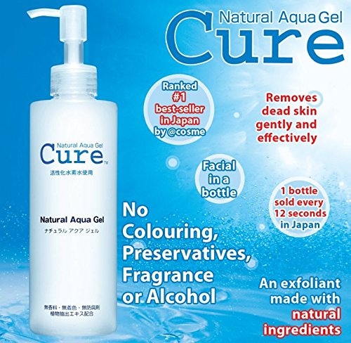Gently removes layers of dry, dead or rough skin to obtain clear, firm, and ideal skin. Suitable for all skin types. (Rinse type). 1.Wash your face as you normally would. Dry off completely. 2. Pump the nozzle 3 to 5 times to obtain the appropriate amount of gel onto your fingertips and apply to the desired area. Leave it on the skin for a few moments allowing Cure to react with the dead skin cells.3. Gently massage in circular motion for 30 seconds to 1 minute. (Do not rub too hard). The gel will turn into a milky white color, and beads of dead skin cells can be seen as they are lifted off the skin.4. Rinse well with water and then follow your regular skin care regime as you normally would.5. For best results, use Natural Aqua Gel twice a week.**Cure can also be used on other parts of the body where dead skin cells tend to accumulate.Feature