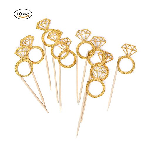 Kakasogo 10 PCS Newest Wedding Bridal Shower Gold Glitter Diamond Ring Cupcake Topper Picks for Marriage Engagement Anniversary Birthday Valentines Party Cake Decor