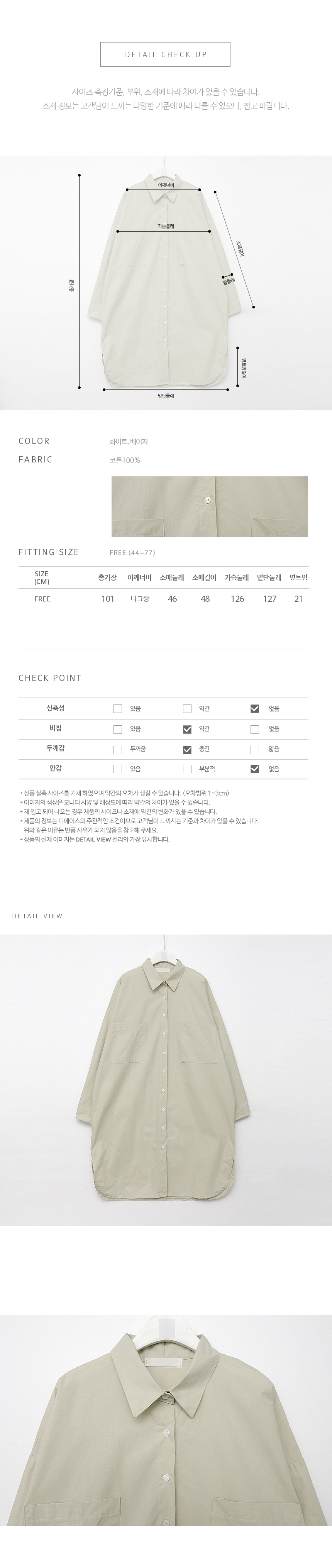 | 018/no_03/03_mos_ops/03_mos_ops_01.jpg" width="860"> 단정한 셔츠 카라에 많이 오버된 어깨선이 여성스럽고 풍성한 오버핏이 여유 있게 툭 떨어지는 멋스러운 셔츠 원피스예요. 바삭한 코튼 100%에 촉감이 기분 좋고 세련된 느낌 가득해 팬츠나 레깅스에 하나만 걸쳐도 세련된 아이템이에요~ 가슴 한쪽 들어간 포켓이 심플한 라인에 포인트가 되어주고 목선의 단추를 풀어 살짝 뒤로 넘겨입어도 멋스러워요! 색상은 화이트, 베이지 사이즈는 FREE44~77 ▼ 관련상품 : 마리 코튼 텐션 SS 레깅스 |