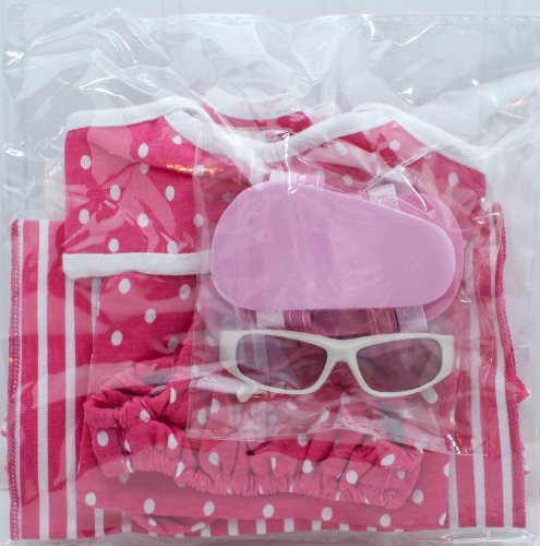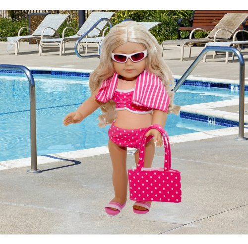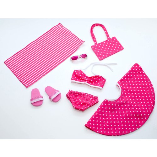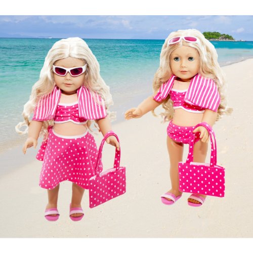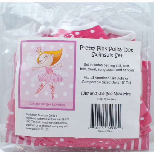 -. Binding : Toy -. Brand : Lilly and the Bee Novelties -. Color : Pink -. Department : toys -. EAN : 0700115649360 -. Feature : Set includes bathing suit, skirt, towel, sunglasses and sandals. / This swimsuit set will fit all 18" dolls. / Swimsuit set is sold exclusively on Amazon / Not affiliated with American Girl official brand. / Doll not included. -. Label : Lilly and the Bee Novelties -. Manufacturer : Lilly and the Bee Novelties -. MPN : RONA-PN-2363514 -. PackageQuantity : 1 -. PartNumber : RONA-PN-2363514 -. ProductGroup : Toy -. ProductTypeName : TOYS_AND_GAMES -. Publisher : Lilly and the Bee Novelties -. Studio : Lilly and the Bee Novelties -. Title : 6 Piece Swimsuit Set for American Girl Dolls: Pretty Pink Polka Dot Swimsuit Set -. UPC : 700115649360